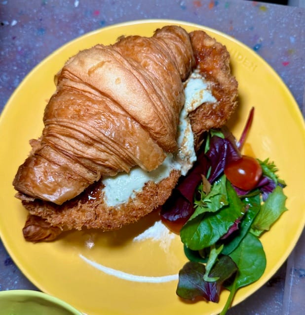But let's get to the Croissando. We had the Hiden Signature—breaded chicken katsu, homemade tartare sauce, and Japanese brown sauce, sandwiched between a surprisingly large, buttery croissant with a small side salad.