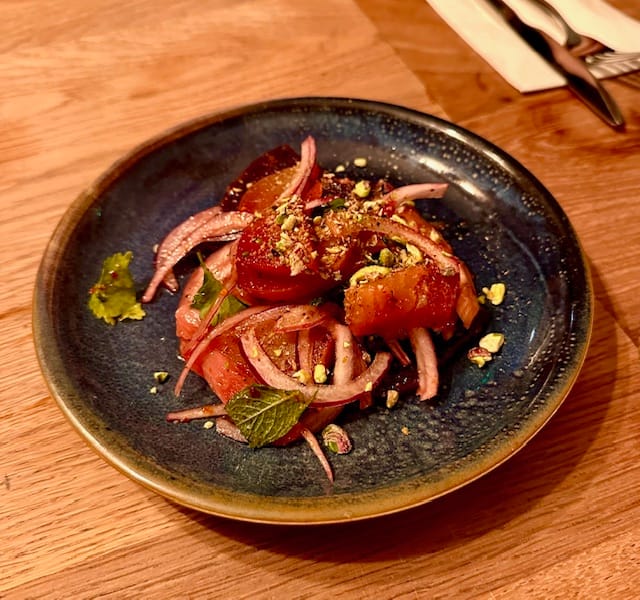 The beetroot, pickled rhubarb, and pistachio salad were heavenly. The sweet beetroots harmonised beautifully with the pickled rhubarb. We loved it so much that we ordered a second plate—and then got one for free because the kitchen accidentally made extra! What a win!