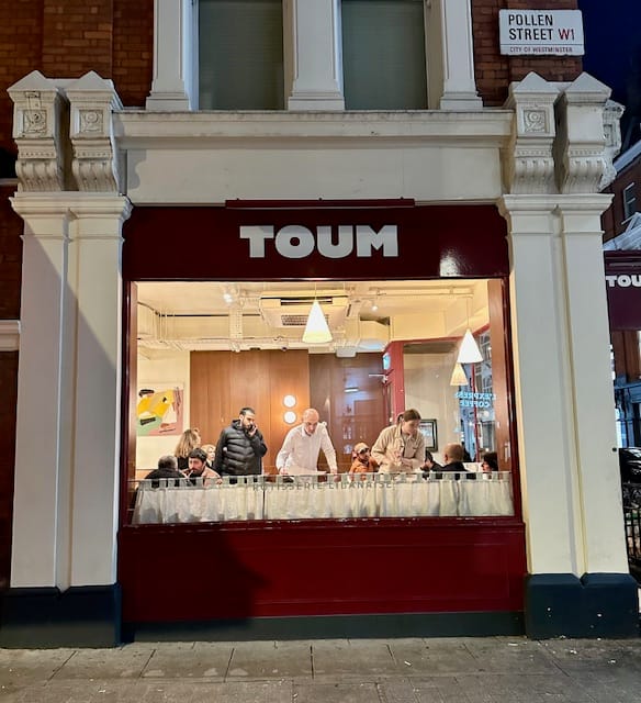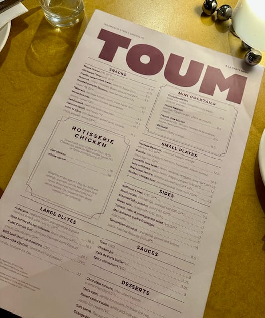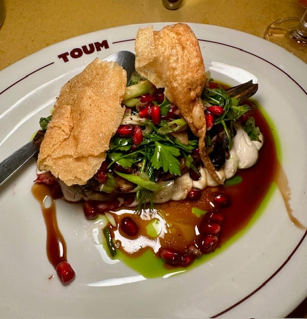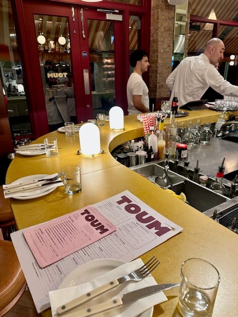 Toum still had a lot of hype, even a year after opening. It’s a Lebanese–French rotisserie with chic cocktail-bar energy. Dark, moody, with really nice burgundy furniture — honestly, pretty sexy and a great spot for date nights.