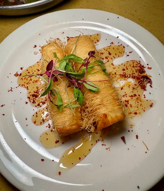 The Halloumi Kataifi with hot honey came first, and if you know me, you know I love a crunch. Fried golden and crispy when you cut through it. The sweetness of the hot honey worked beautifully with the salty cheese, very much giving spring roll energy. I liked it.