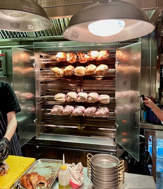They were genuinely kind and accommodating — they even opened the rotisserie doors so we could take photos and videos of the very slowly rotating chickens.