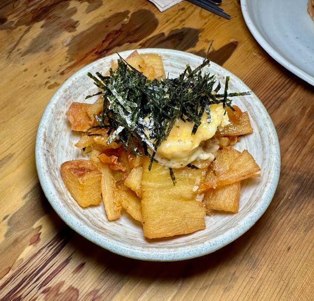 I love potatoes in all forms, and the Double-Cooked Potatoes with Miso Butter were no exception. Sliced thousand-layered potatoes, fried and topped with a ball of homemade miso butter and toasted seaweed that then melts onto the potatoes. Rich, savoury, and oh-so-moreish. Another good sharing dish to have.
